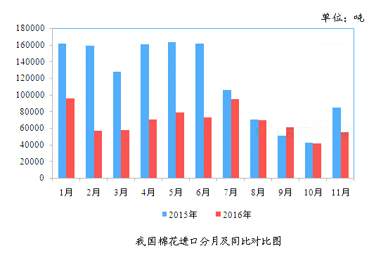 據(jù)中國海關(guān)總署統(tǒng)計(jì),2016年11月,我國進(jìn)口棉花5.50萬噸,環(huán)比增加1.36萬噸,增幅32.99%;同比減少2.95萬噸,減幅34.92%;2016年1-11月,我國累計(jì)進(jìn)口棉花75.12萬噸,同比減少53.47萬噸,減幅41.58%。2016/2017年度,我國累計(jì)進(jìn)口棉花15.70萬噸,同比減少2.06萬噸,減幅11.59%。